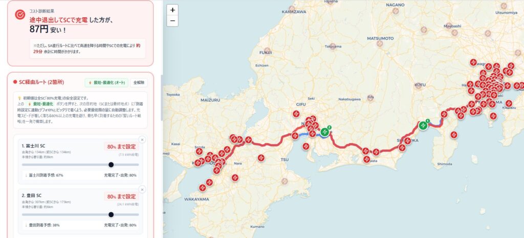 使い方は超シンプル。出発地と目的地を入力し、地図上に表示される寄りたいSCのピンをワンクリックするだけで、自動的に最適なルートが完成します。さらに魔法の「オートボタン」を押せば、**「このSCでは〇〇%まで充電して出発すれば、最速で到着できる」**という完璧な充電戦略を全自動で計算してくれます。