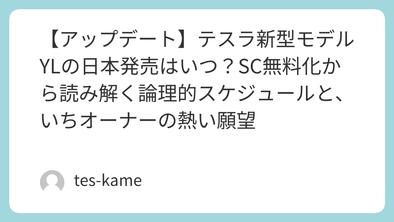 🔄 【前回の記事からのアップデート情報】 以前の[こちらの記事(※内部リンク:モデルYL最新情報まとめ)]にて、**「早ければ2026年4月に日本でもモデルYL(3列シート&V2L搭載)の発表があるかもしれない」と予測していました。 しかし、2026年4月1日。テスラジャパンが発表したのは新型車ではなく、現行モデルを対象とした「スーパーチャージャー(SC)3年間無料キャンペーン」**という特大の飛び道具でした。 このビッグニュースと海外の最新動向を論理的に掛け合わせ、モデルYLの日本上陸時期に関する「最も現実的な予測」と「ポジティブな願望」へアップデートしてお届けします!