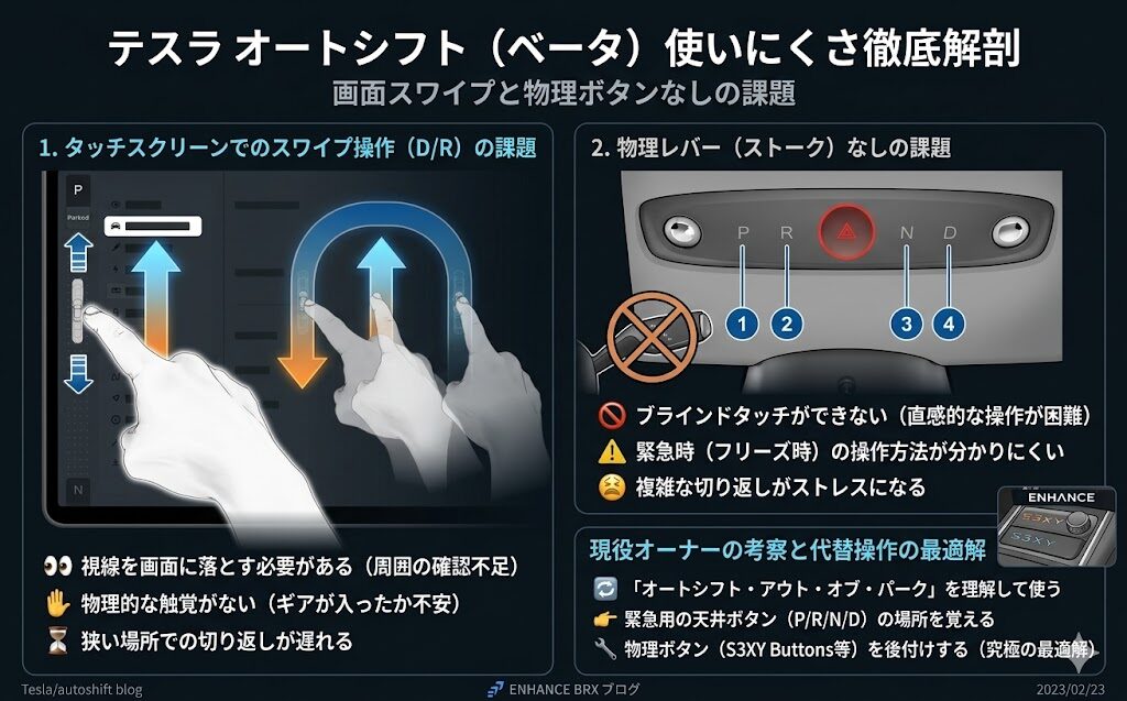 - 「ブラインドタッチができず、ギアが入ったか不安になる」 (従来の物理レバーは「カチッ」という触覚フィードバックがありましたが、画面スワイプは触覚がないため、本当にリバースに入ったのか確証が持てず、アクセルを踏むのに一瞬の躊躇が生まれます。)